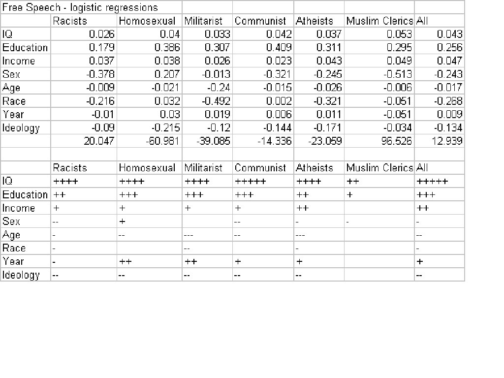 Also the racist question already included a direct interest group i.e. race. Of the four where I was able to find a group three of the groups were clearly more in favor of their interests being aired or banned (for racism and atheism). For the homosexuals they are universally in favor of being able to have their say but the numbers of cases are too low to show statistical significance. Smart blacks are in favor of allowing racists their say. Smart anti-communists and strong believers in God support allowing communists or vocal atheists to argue their points. Note that higher IQ still favors allowing free speech.